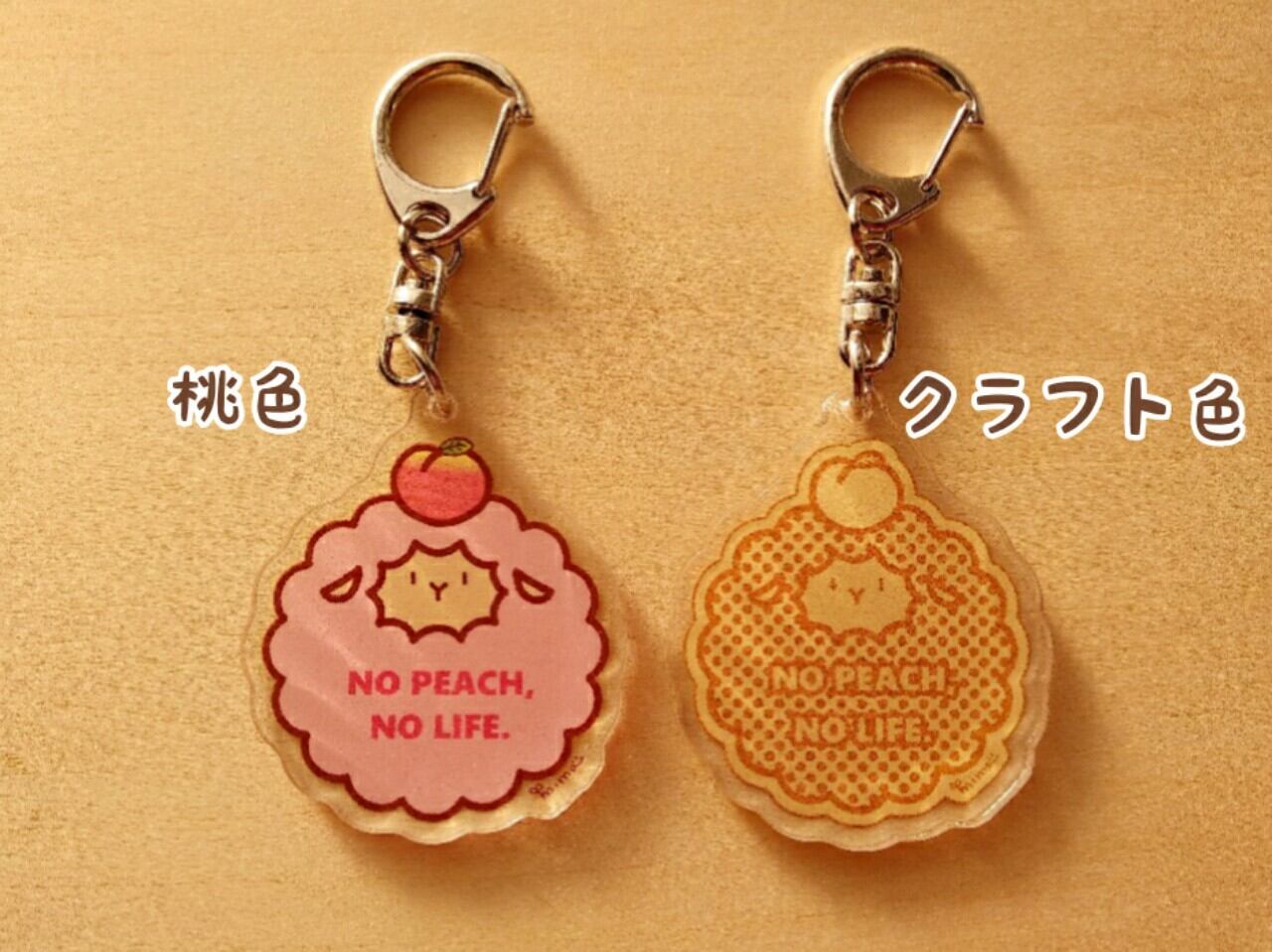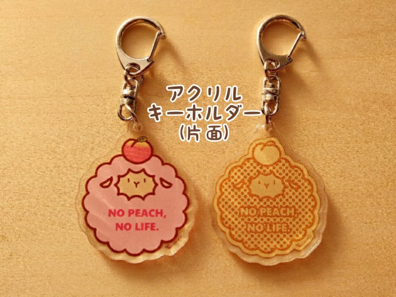 頭に桃を乗せたちびもこさんのアクリルキーホルダーです。裏側はコーティング無しの白地です。