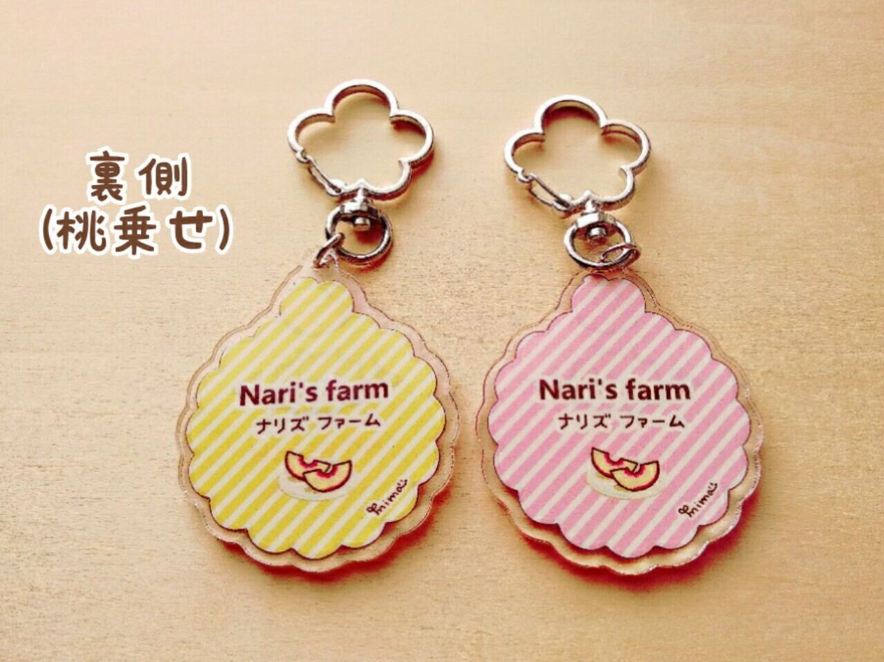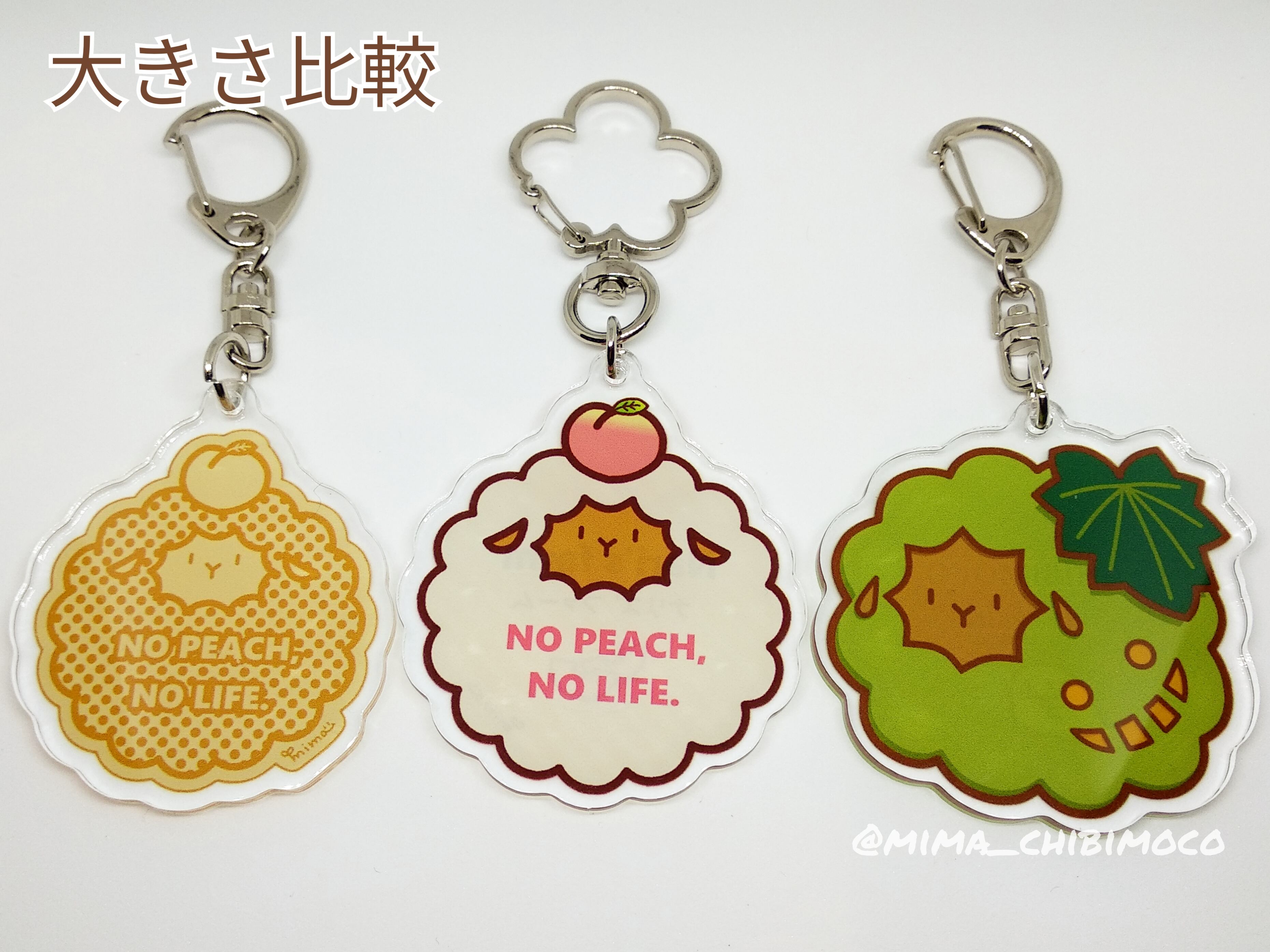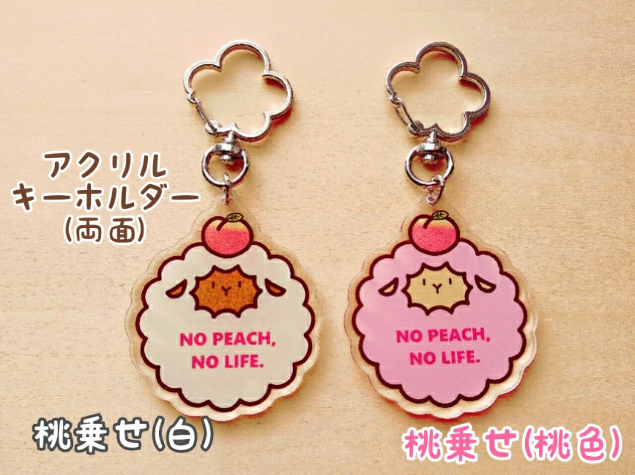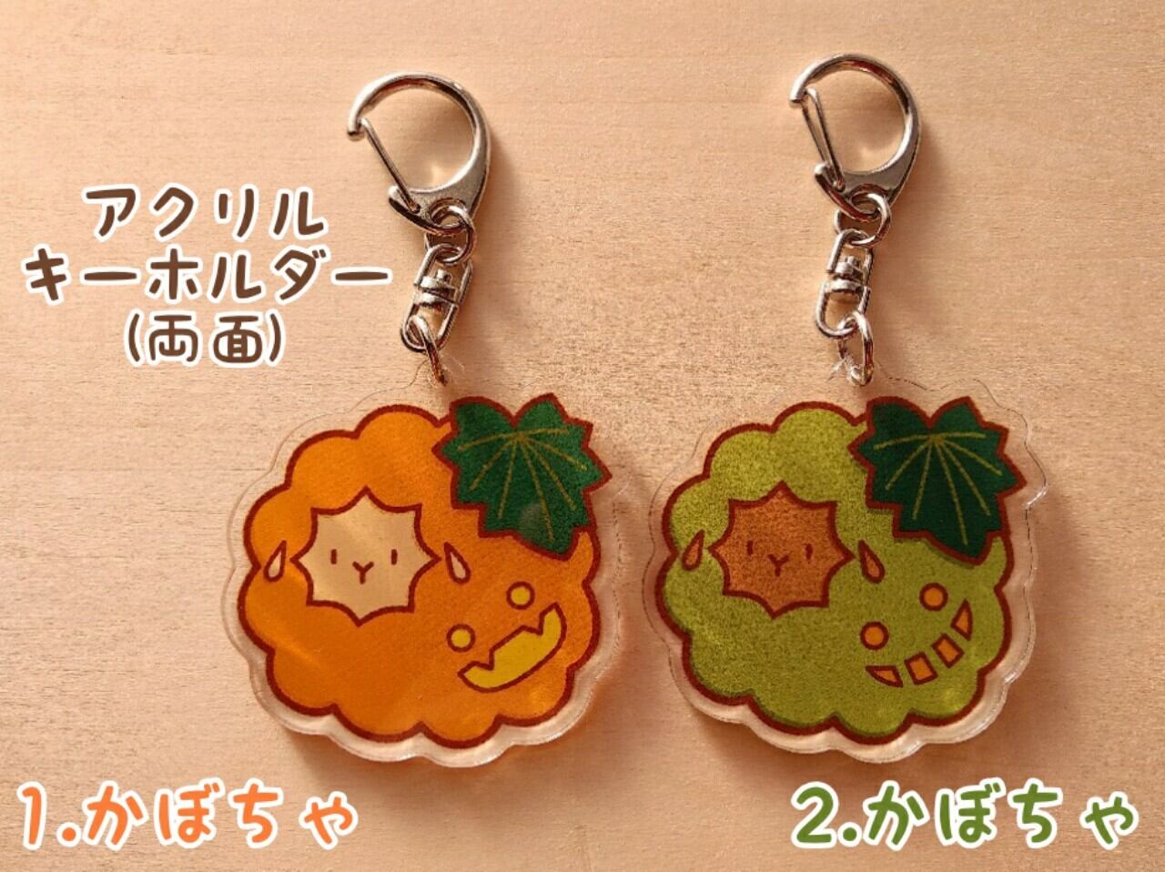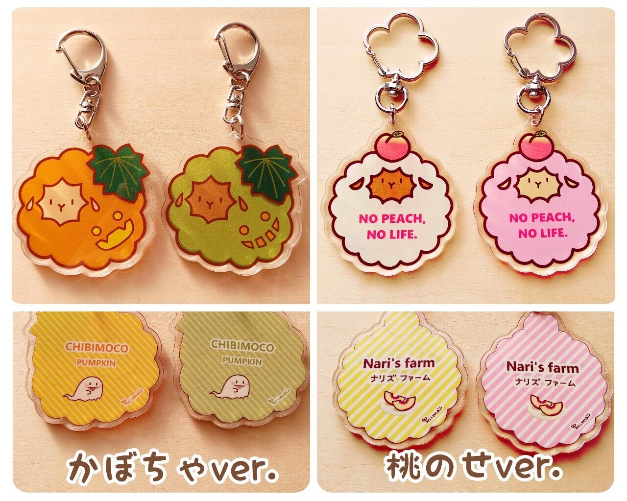 頭に桃を乗せたちびもこさんと、かぼちゃさんのアクリルキーホルダーです。裏面印刷・コーティング有りです。